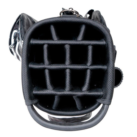 10" 14 Way top with two cart easy access handles and a front integrated grab handle for the trolley user and an extra large putter well divider 14 Full length dividers covered with colour coordinated air mesh cushioned fabric Key lock base to keep bag firmly on the trolley All pockets face forward for easy access Padded shoulder strap for easy carrying External extra large putter tube Semi umbrella sheath at front of bag for easy accessibility Includes ball liner tool, pen holder, ball holder and moulded tee holder Full length rain cover 10 Strategically placed pockets which include: Waterproof fur lined valuables pocket, wet pocket, cooler pocket, ball pocket, mobile phone sleeve, expandable clothing pocket .