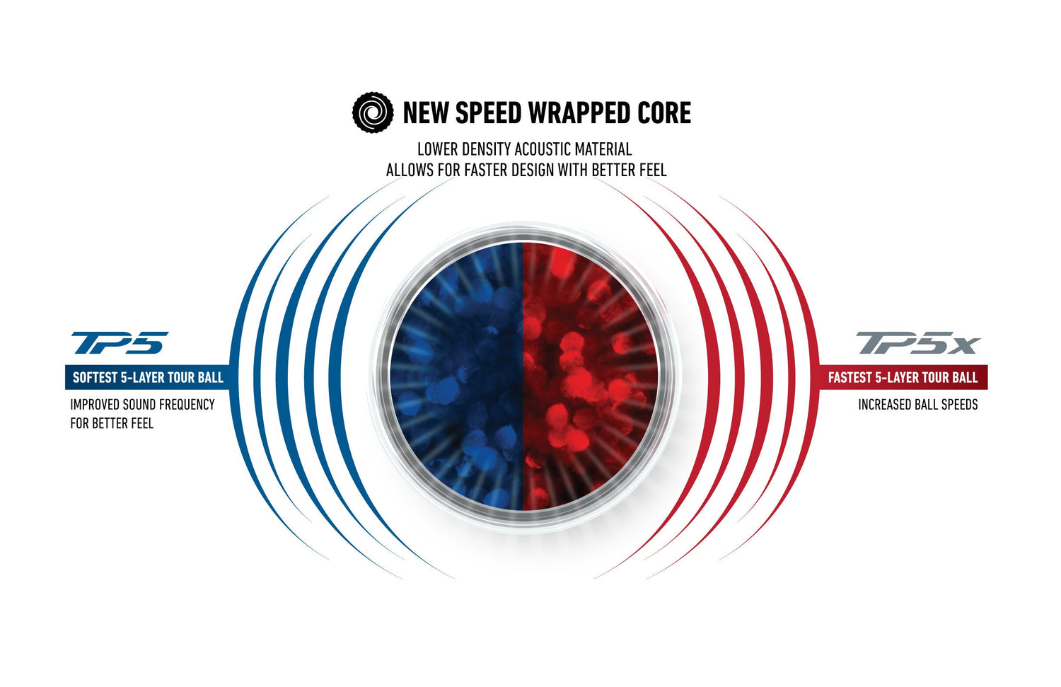 The TP5, the softest 5-layer Tour ball, delivers a notably softer feel and enhanced spin around the green with lower driver spin than previous generations. It is engineered with a new Speed Wrapped Core that delivers a softer sound while promoting a faster, more responsive overall design. For golfers who prioritize touch and feel in their short game, the TP5 provides precision greenside performance.