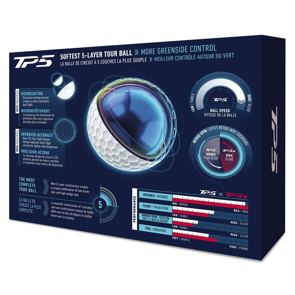 TP5 has long been our softest five-layer Tour ball, but now it’s faster than ever. Employing our largest Tour core to date, the TP5 retains more energy at impact, which results in faster ball speeds and more distance at the top of your bag.